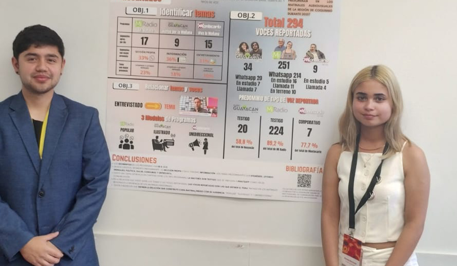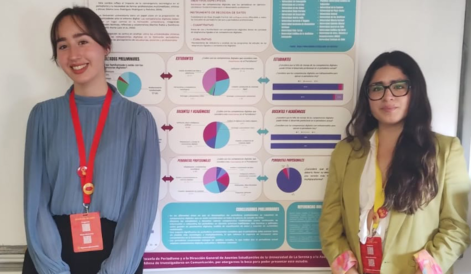“Matinales en el territorio: voces y agenda en las plazas públicas audiovisuales de la región de Coquimbo”, fue la investigación presentada por los estudiantes de cuarto año, Joaquín Ugarte y Renata Bermont, quienes manifestaron una gran alegría y satisfacción al haber podido ser parte de este congreso y presenciar una gran cantidad de ponencias y tener la oportunidad de presentar su propio trabajo, el cual es parte del mencionado Fondecyt Regular N° 1240145.