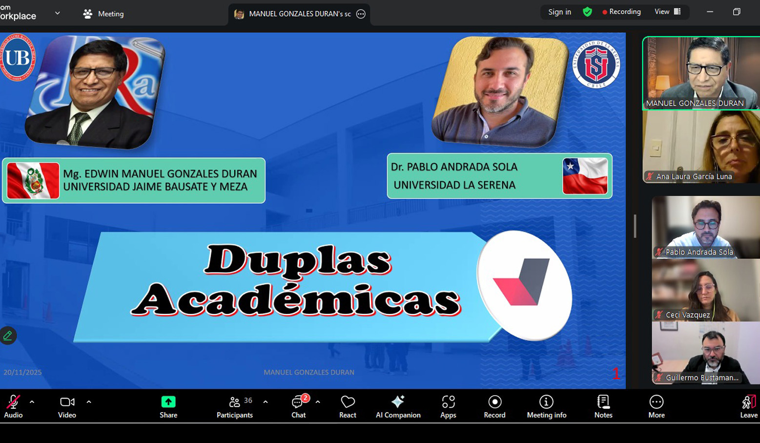 En el encuentro expusieron distintos académicos que formaron parte del programa “Yo Te Invito”, entre ellos el Dr. Pablo Andrada Sola y el Dr. Manuel Gonzales Durán, académico de la Universidad Jaime Bausate y Meza (Perú). Ambos presentaron sus experiencias, desafíos y reflexiones en torno al trabajo realizado en duplas educativas, compuestas por estudiantes de Chile y Perú, así como los aprendizajes colaborativos aplicados para transformar la enseñanza.